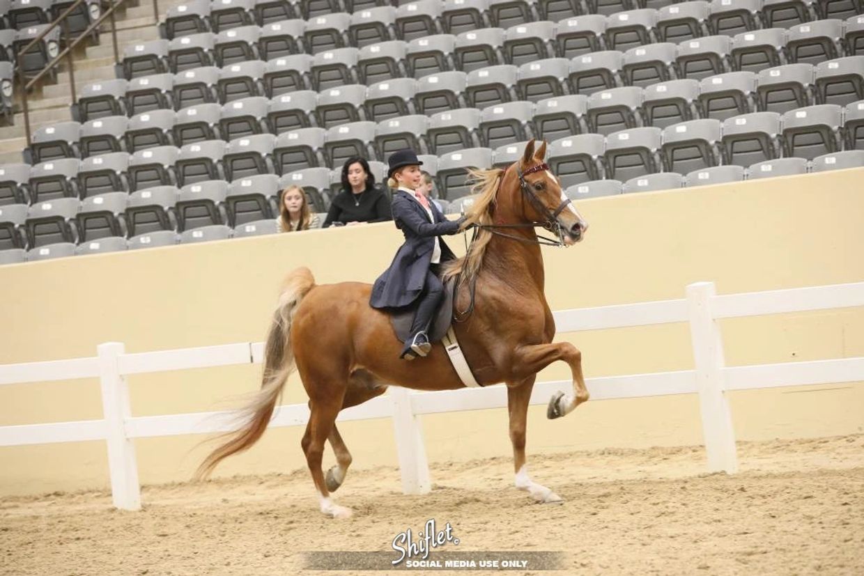 15.3 hand chestnut gelding trimmed in white. With wins or serves in 10 & Under Walk and Trot and Equitation.
